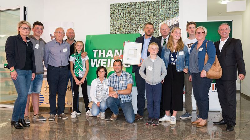 24.07.2017Inhaber Stefan Thomaseth war zu diesem Anlass mit seiner Familie eigens aus dem italienischen Kastelruth angereist. Gregor Baumbusch, Weinig Vorstand Vertrieb und Marketing, gratulierte und überreichte zusammen mit seinen Vorstandskollegen zur Erinnerung eine Plakette mit dem original Teilnahmecoupon des Gewinners. „Der Cube Plus steht mit seiner hochwertigen vierseitigen Bearbeitung auf der Basis eines einfachen Bedienkonzeptes stellvertretend für die Philosophie unseres Hobel-maschinenprogramms“, sagte er vor den rund 700 Gästen des Sommer-festes.